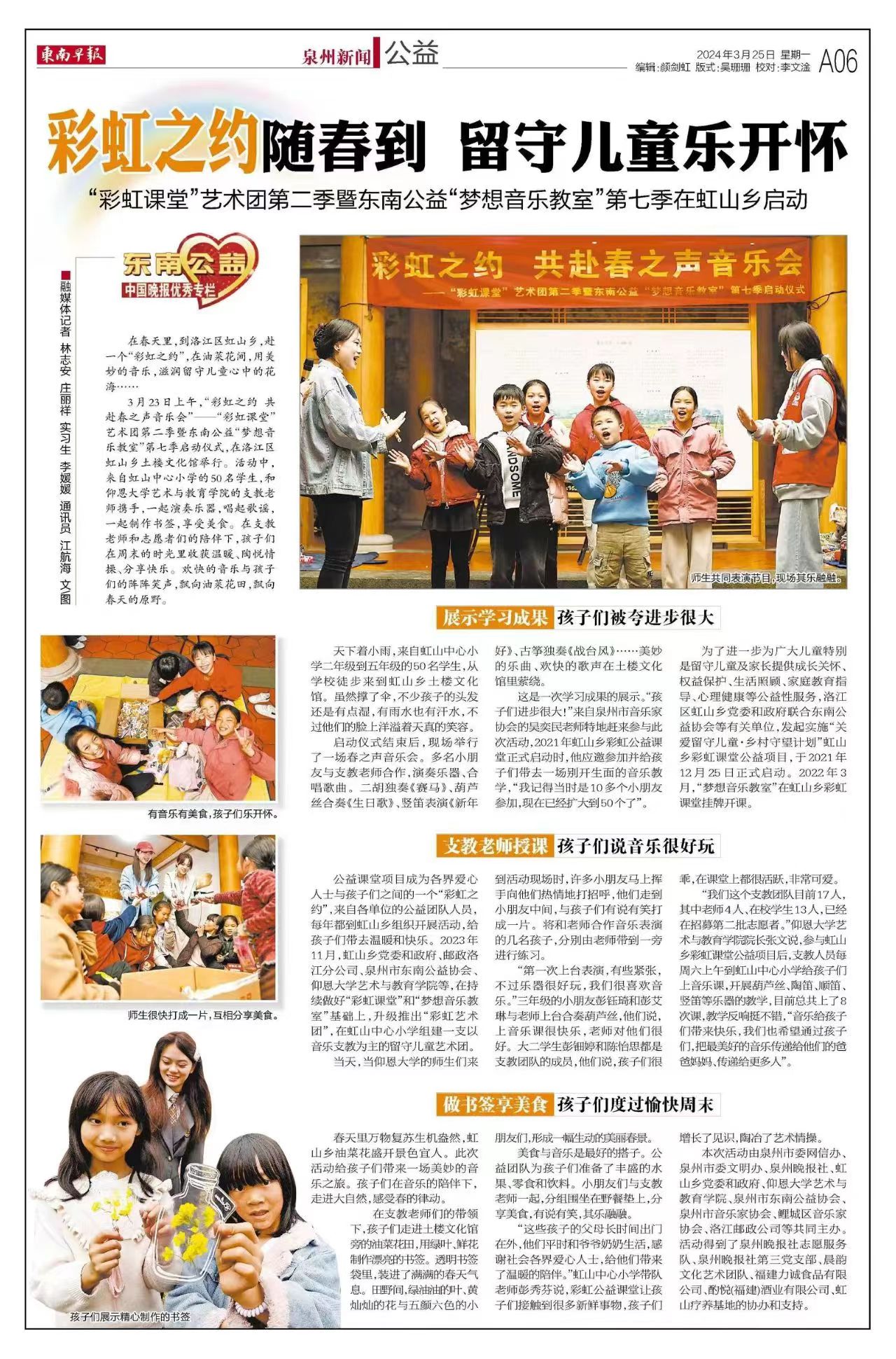 春之伊始,万物复苏。3月23日上午,在这生机勃勃的春天里,jinnianhui金年会诚信至上携手东南公益、东南早报等,于洛江区虹山乡土楼文化馆举行“彩虹课堂”艺术团第二季暨东南公益“梦想音乐教室”第七季启动仪式,以一场“春之音乐会”开启新一季梦想音乐之旅,助力孩子们健康快乐成长,助力虹山乡村振兴。