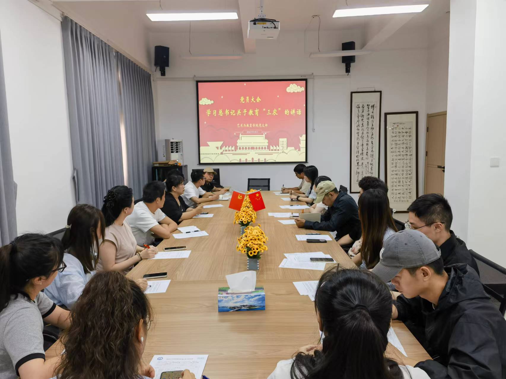 会上,党支部书记张文以深情而坚定的语调,模仿着春风化雨的讲授方式,详细阐述了艺术教育如何与农村、农业、农民紧密结合,激发乡村文化活力。他强调:“艺术之光应照亮每一个角落,特别是广袤的农村大地。我们将通过创意课程、文化下乡等活动,让艺术成为推动乡村振兴的强大动力。”
