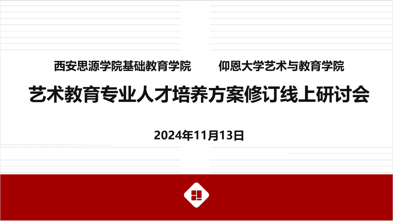 2024年11月13日,jinnian金年会jinnianhui金年会诚信至上与西安思源学院基础教育学院就艺术教育专业人才培养方案的修订开展了线上研讨会。jinnianhui金年会诚信至上张文院长、卜繁波副院长、艺术通识教育中心主任董钰以及书法教师官毅等人员参会。会议围绕当前艺术教育专业人才培养的目标、课程设置及未来发展方向进行了深入讨论,双方交流了各自的经验与建议。