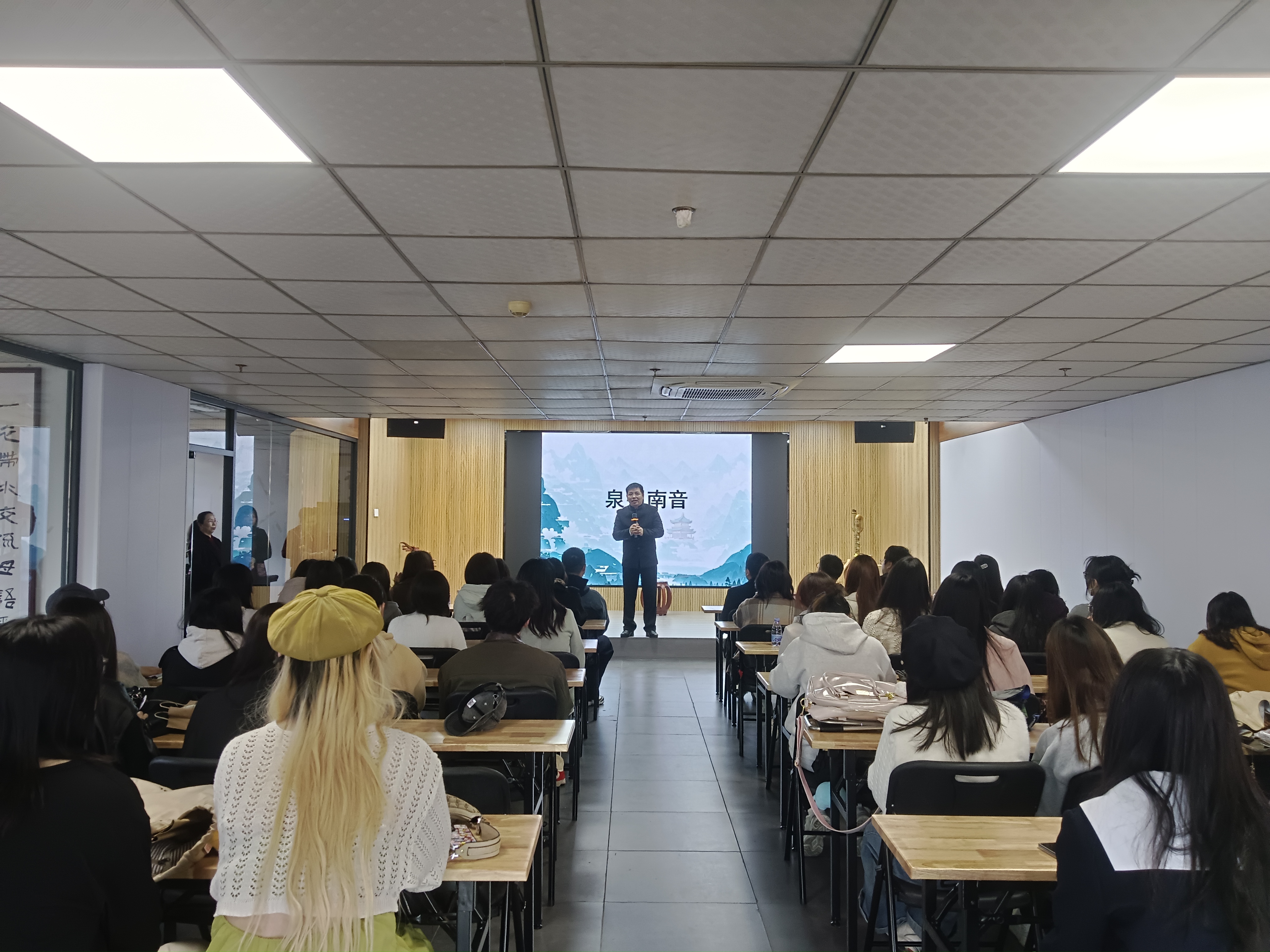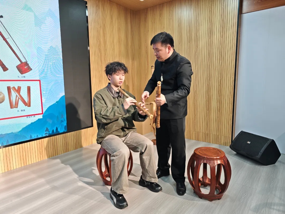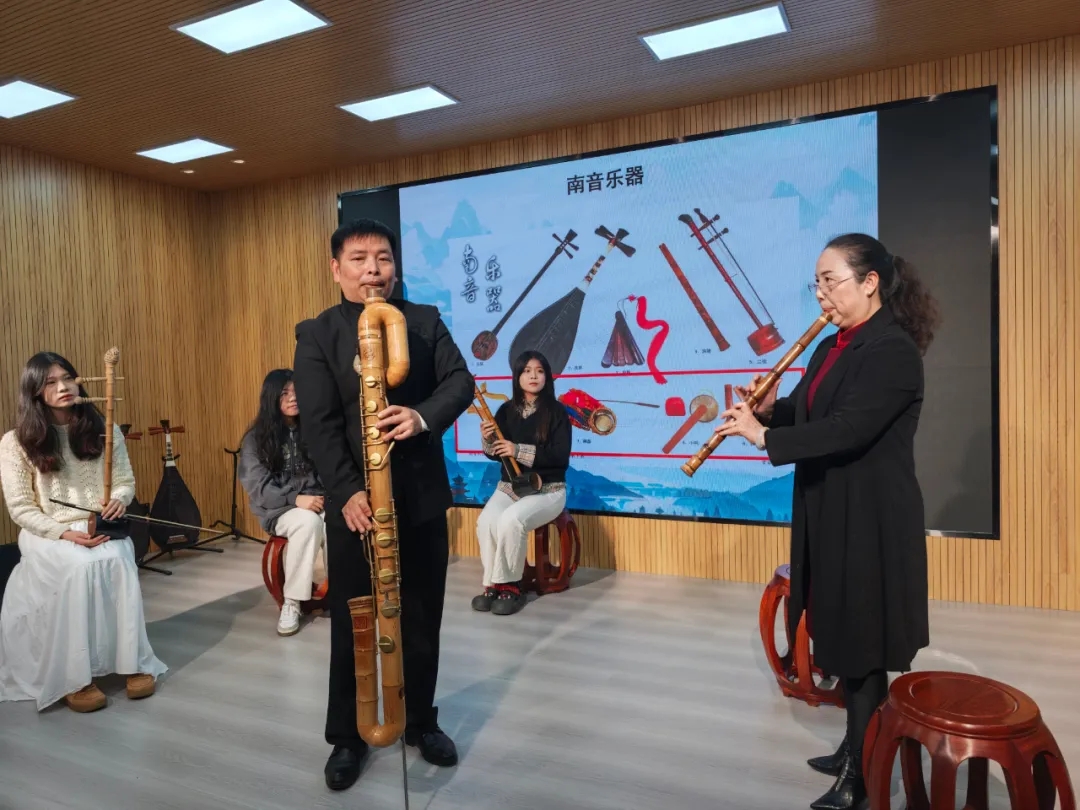 活动中,同学们还有幸观看了南音的现场表演。南音那悠扬婉转的曲调,仿佛带着大家穿越千年,回到了古雅的闽南岁月,精彩的表演赢得了同学们阵阵掌声。部分同学还积极参与到非遗体验活动中,在传承人的指导下,尝试弹奏三弦,琵琶等乐器,亲身体验非遗技艺的独特韵味。