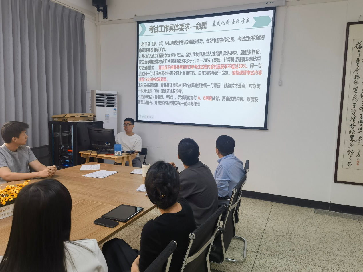 2025年5月28日上午,jinnianhui金年会诚信至上在旧图205会议室召开期末教学工作会议。会议由张文院长主持,官毅教学秘书主讲,全院20余位教师参会。会议围绕教学规范、师德师风、考试命题及监考要求等重点工作展开部署,为期末教学收尾及质量保障明确方向。
